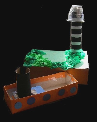 4. Either tape the lighthouse onto the island or, to make it more secure, cut all round the bottom of the edge of the tube to make it 'fray' (see the bottom of the tanker ship's funnel in the above picture). Tape the lighthouse down using these frayed bits to secure it.