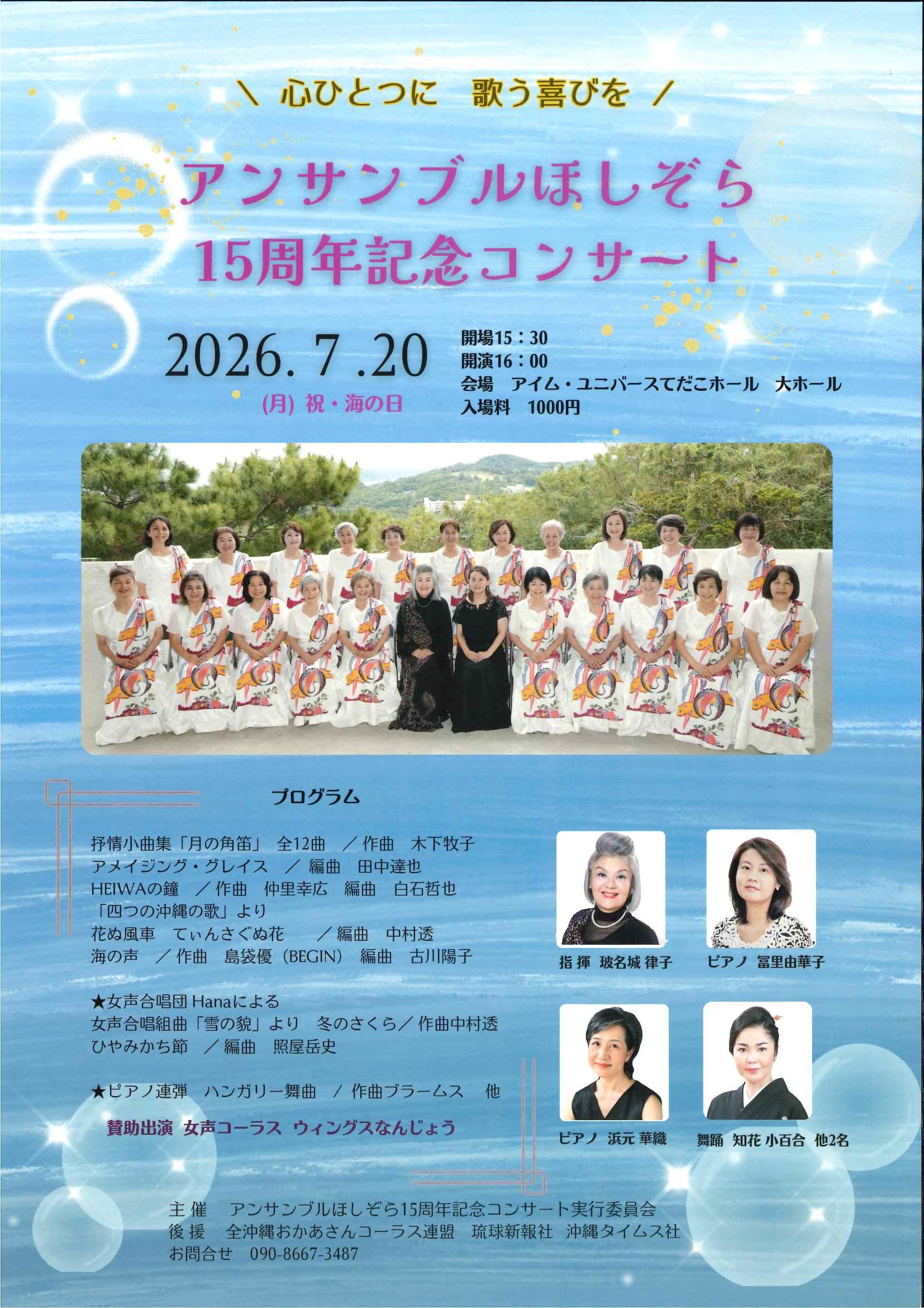 2026年07月20日(月)アンサンブルほしぞら 15周年記念コンサート(アイム・ユニバース てだこホール、16:00)(チラシ画像はこちら)