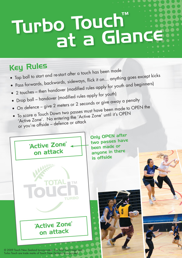 Turbo Touch® was developed by Touch New Zealand in association with Ike Tapine-Wilson and George Albert-Jahnke, two Touch players who wanted to create a sport that could be played all year, indoor and out, that a wide range of people could enjoy. It launched in Wellington in 2009, with competitions in Auckland, Northland, Tauranga, Central and South Island close behind.