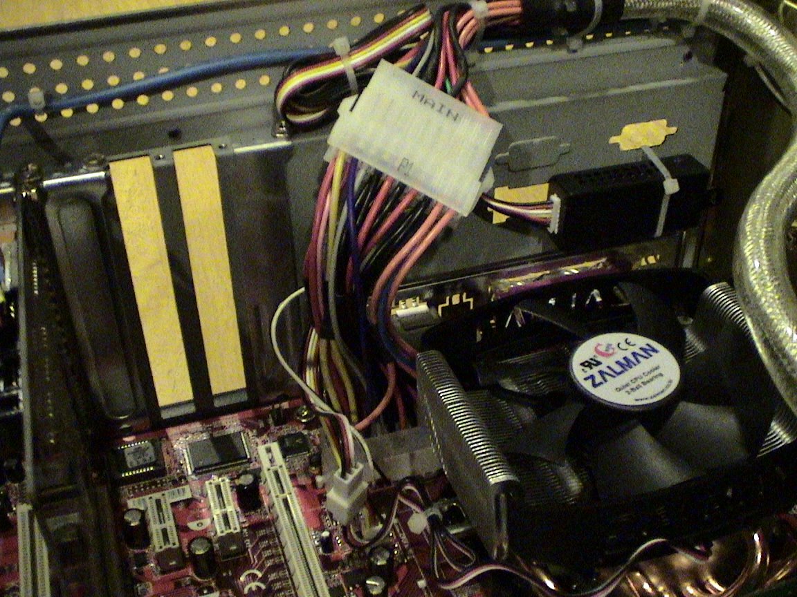 What a sad...sad day. I just got the video card, and was very excited to install it. I don't currently have a large SATA drive, so I connect a small IDE drive to get myself going and try out the hardware. I powered on and nothing...no fans, no LED...nothing. I quickly turned off the power, and rechecked all connections...everything seemed fine. Thinking the supply did not have enough juice, I disconnected the video card, Nexus fan, and hardrive and DVD drive....still nothing. Thinking still it was the power supply I swapped it with a generic version. CPU fan powered on. Tried a Theraltake supply from the MediaPVR, and it did nothing. I then disconnected the 4-pin molex Aux connector from the board and the system worked. So the problem was with the 4 pin connector that supplies additional 12V to the board...which I found out powers the graphics card "cooling system" . Taking out my trusted DMM, I found that there was only ~9 ohms between 12V rail to ground through that connector.