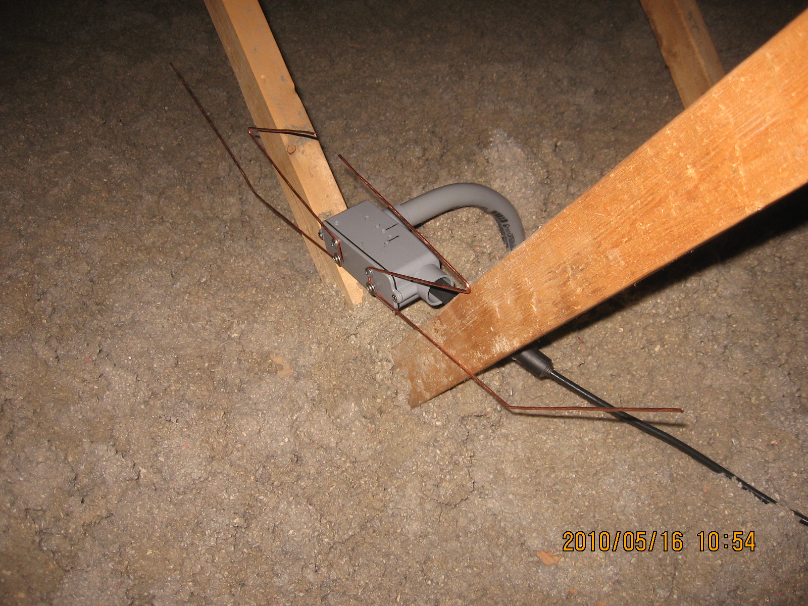Even in that horrendous mounting location, I was able to pickup VHF11 and VHF13 pretty decently. But I couldn't get VHF9, which was one of the important stations. The next day, I went back up and attempted to mount it higher up, but the attic was getting too hot to stay for any length of time. I wasn't happy with how it was mounted, but I was still able to get a very snowy VHF9, along with snowy VHF5 and 6, and a really clear image on VHF11 and VHF13.