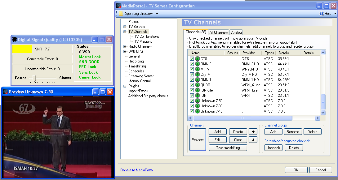 Never thought I'd keep on adding entries to this page. Most recently though, I was able to receive WNGS, which just started broadcasting on out of Buffalo on a low power transmitter at RF7. This was my first VHF digital station, and the Hawk picked it up at 75 miles away. I'm hoping that this will be good news to come for the transition, and it's always nice to get a new channel from time to time. Below are the screen captures of WNGS with MediaPortal: