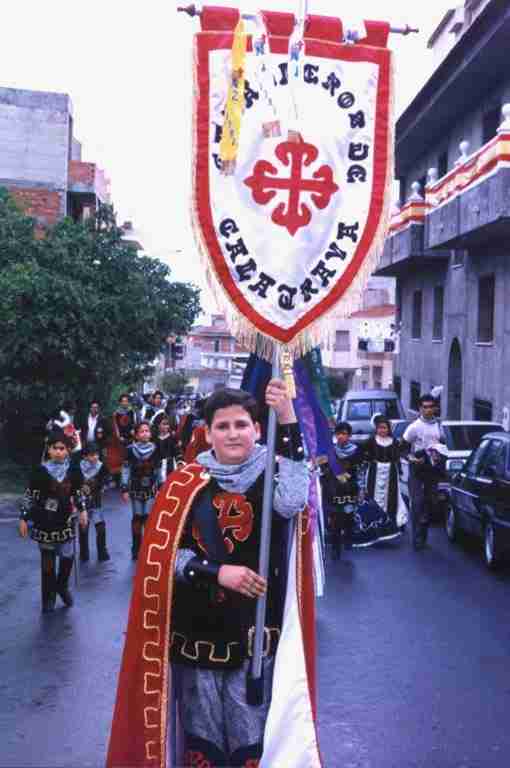 Cuando llegan las seis de la tarde Calatrava alza su banderín, organiza sus filas y las bandas de música marcan nuestro ritmo con marchas cristianas. Comienza el desfile y a ritmo de Paquito el Chocolatero la Mesnada avanza a la plaza recogiendo el calor del pueblo para el que desfila, Abanilla.