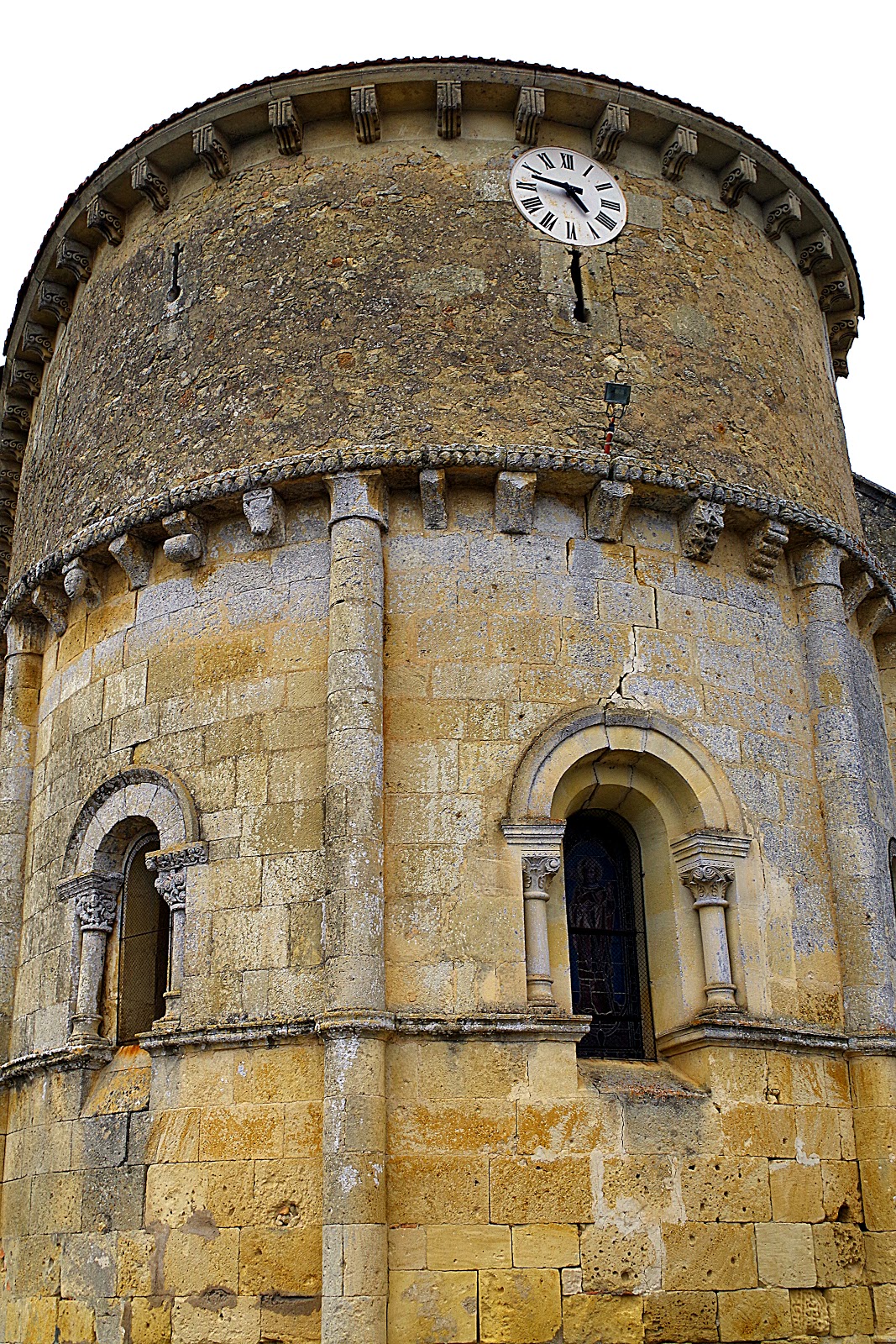 L'ancien portail roman est remplacé au XIXè siècle par un fac-similé et une corniche de modillons purement décorative.