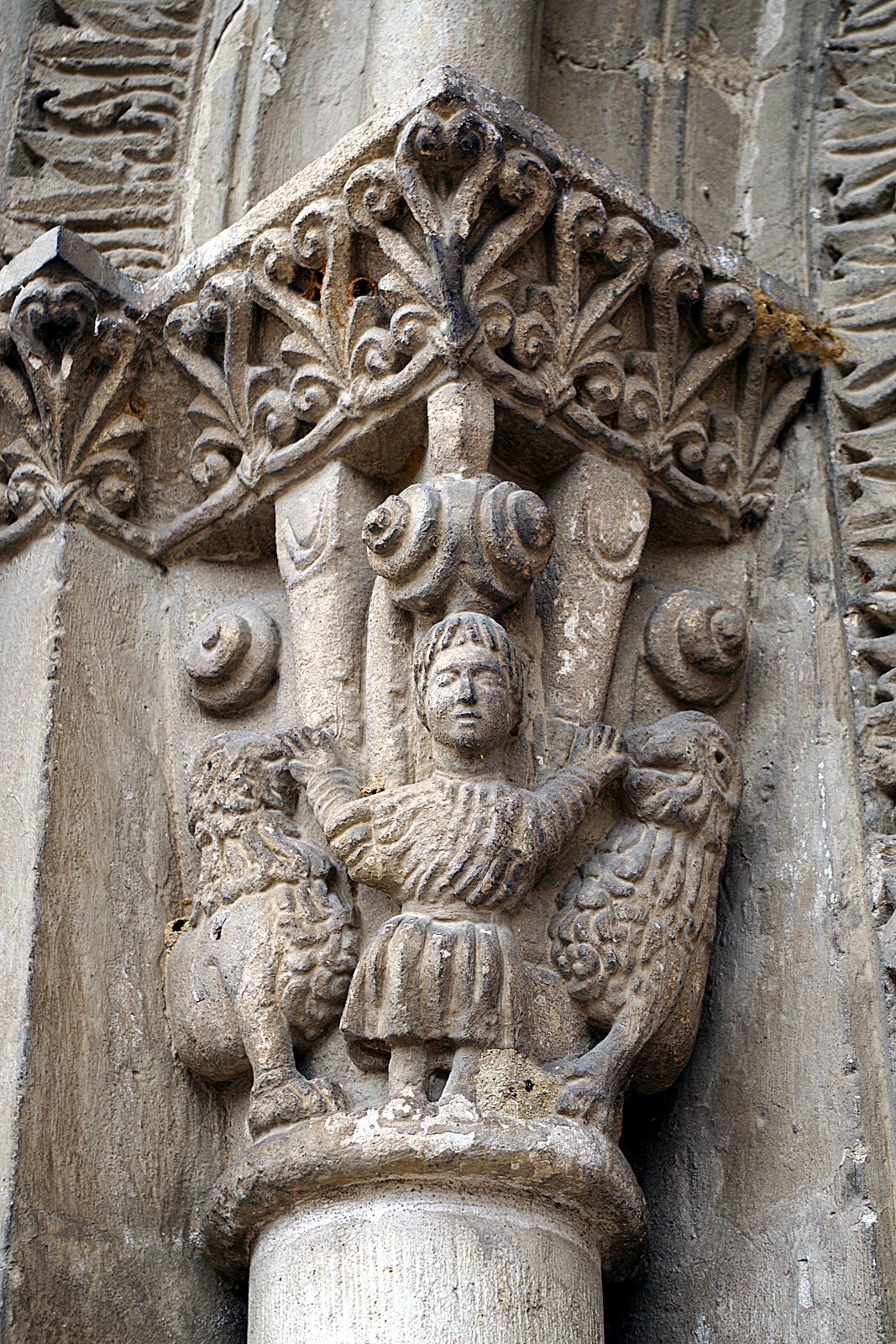 Les chapiteaux du chœur représentent Adam et Ève au paradis terrestre, David domptant le lion et l’Adoration des Mages.
