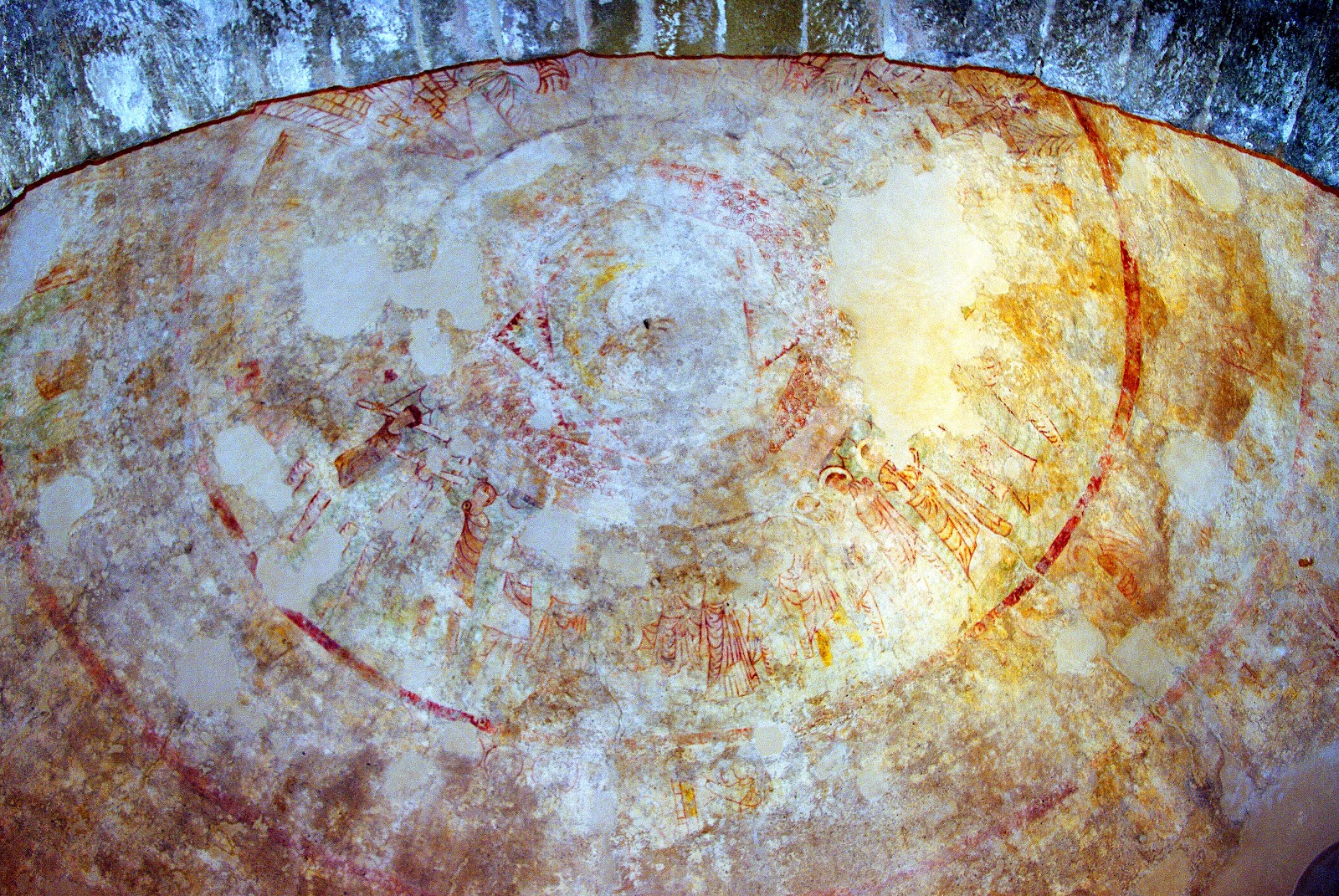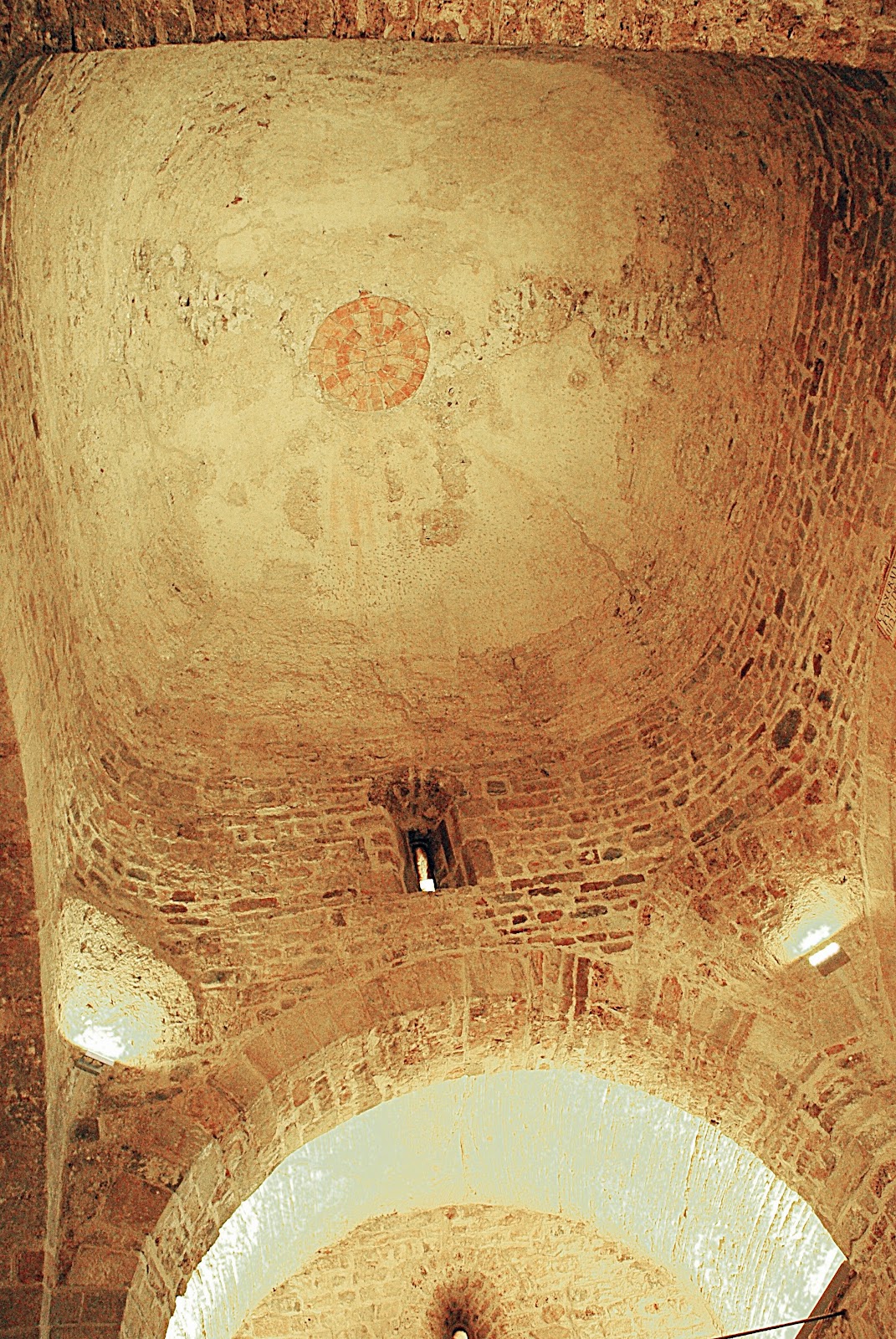 La voûte de l'abside est couverte de peintures murales de type linéaire, avec des traits rouges et verts, qui racontent la vie et la passion du Christ; elles sont datées du Xè siècle.
