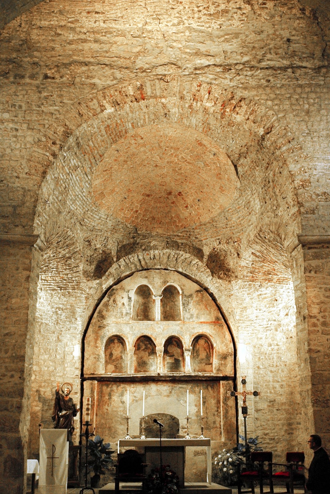 À l'intérieur, l'abside a un sol couvert de mosaïques du Xe siècle avec des motifs géométriques, selon la tradition romaine. L'abside centrale est fermée par un retable en pierre en trois registres, le premier avec des peintures murales du XIe siècle, encore de type préroman, et les deux supérieurs, à l'intérieur d'arcs aveugles, avec la représentation de Saint Pierre, Jésus, les Évangélistes et d'autres personnages de la bible.