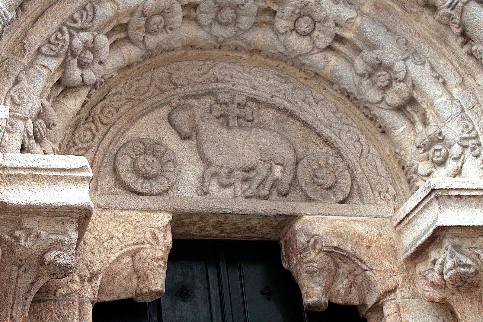 Sur le mur nord la porte offre un tympan bien conservé décoré de l'agneau crucifère entre de grandes fleurs, soutenu par deux têtes de taureaux.