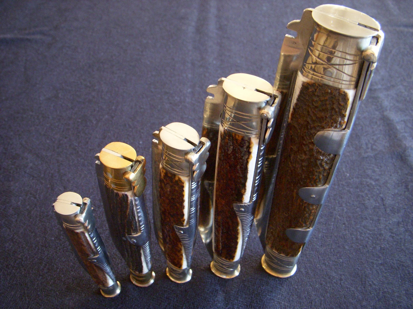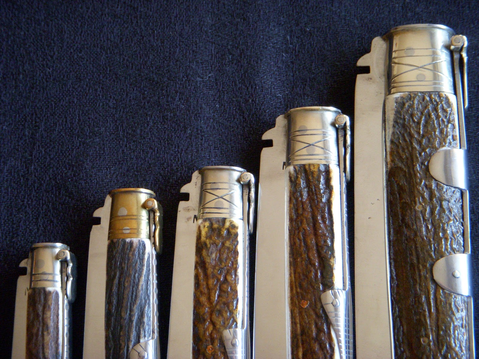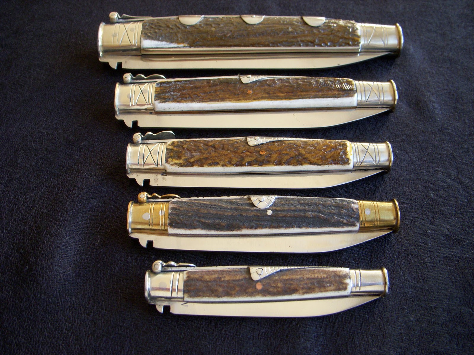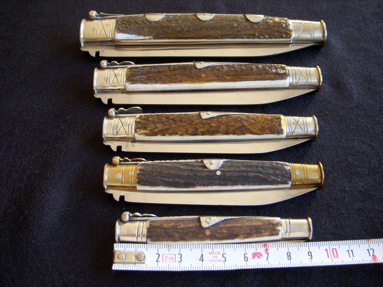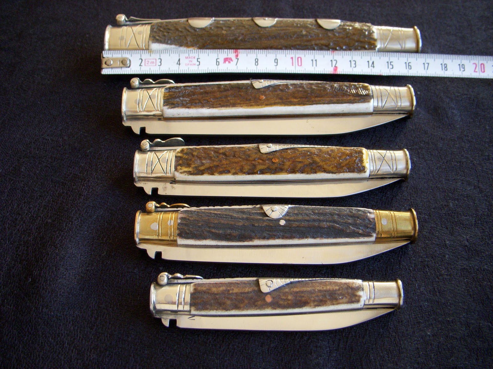 Tienen asta de ciervo, cuchilla de acero al carbono, muelle de acero, casquillos de alpaca y la palanquilla también de alpaca y lia.