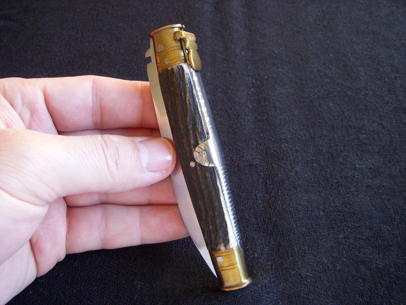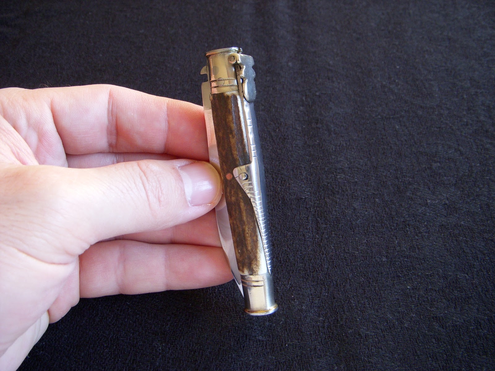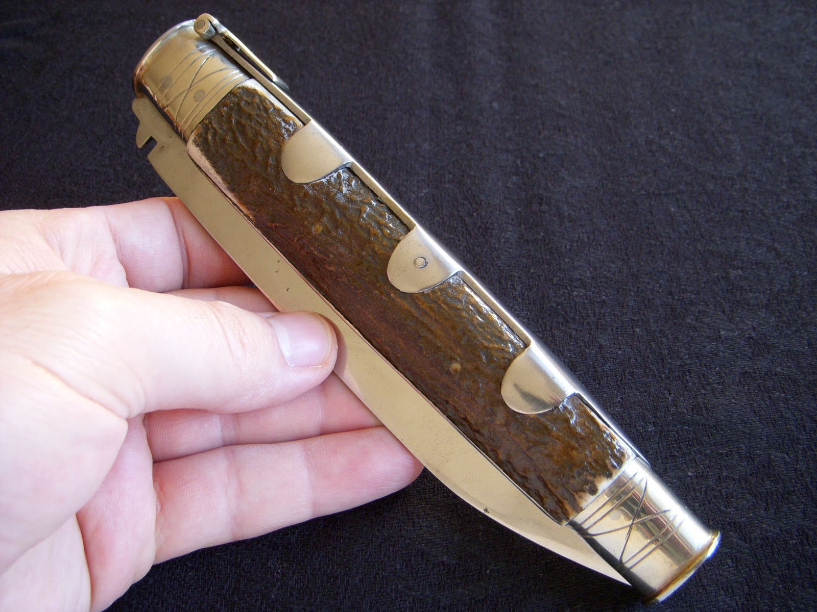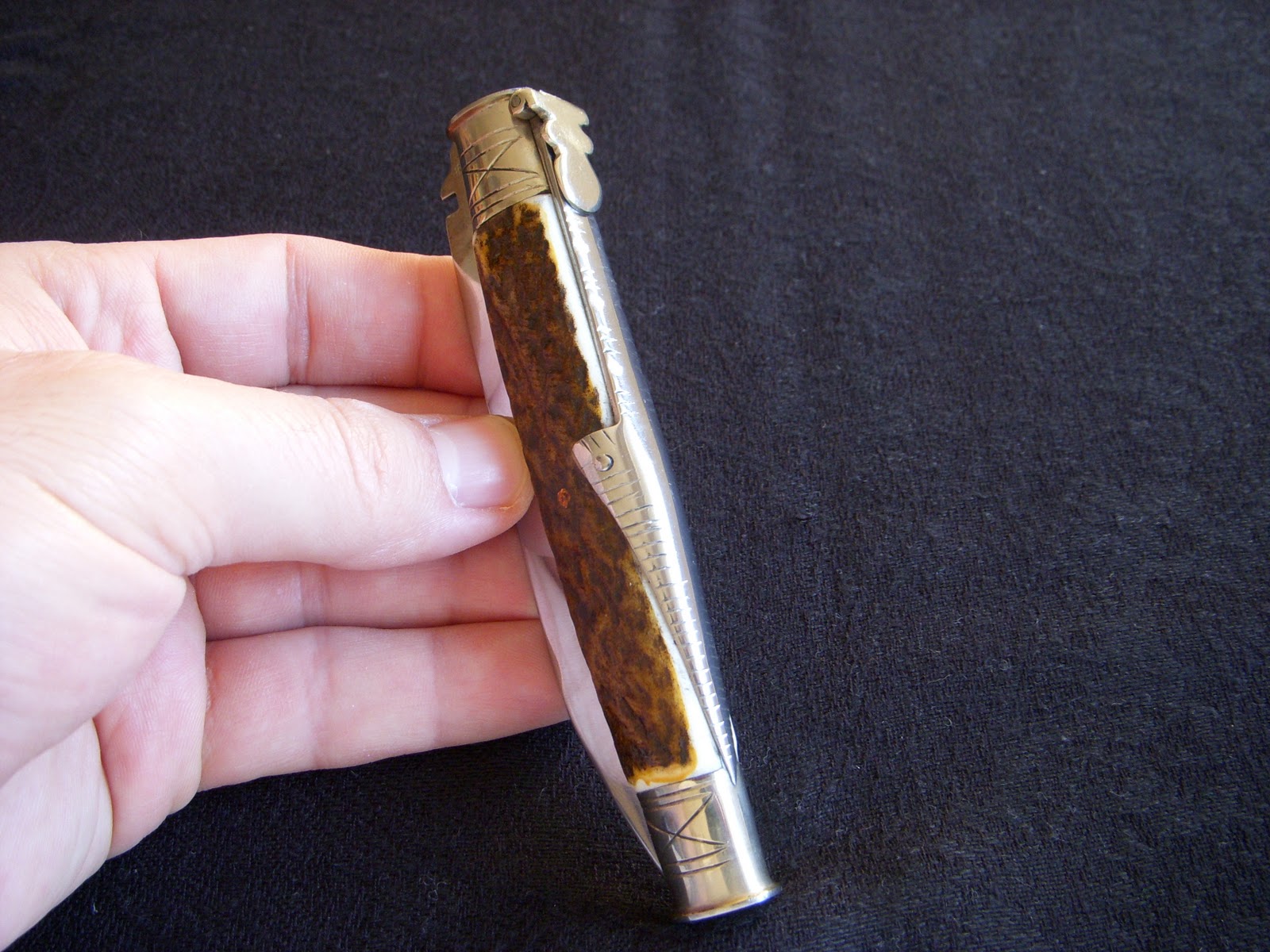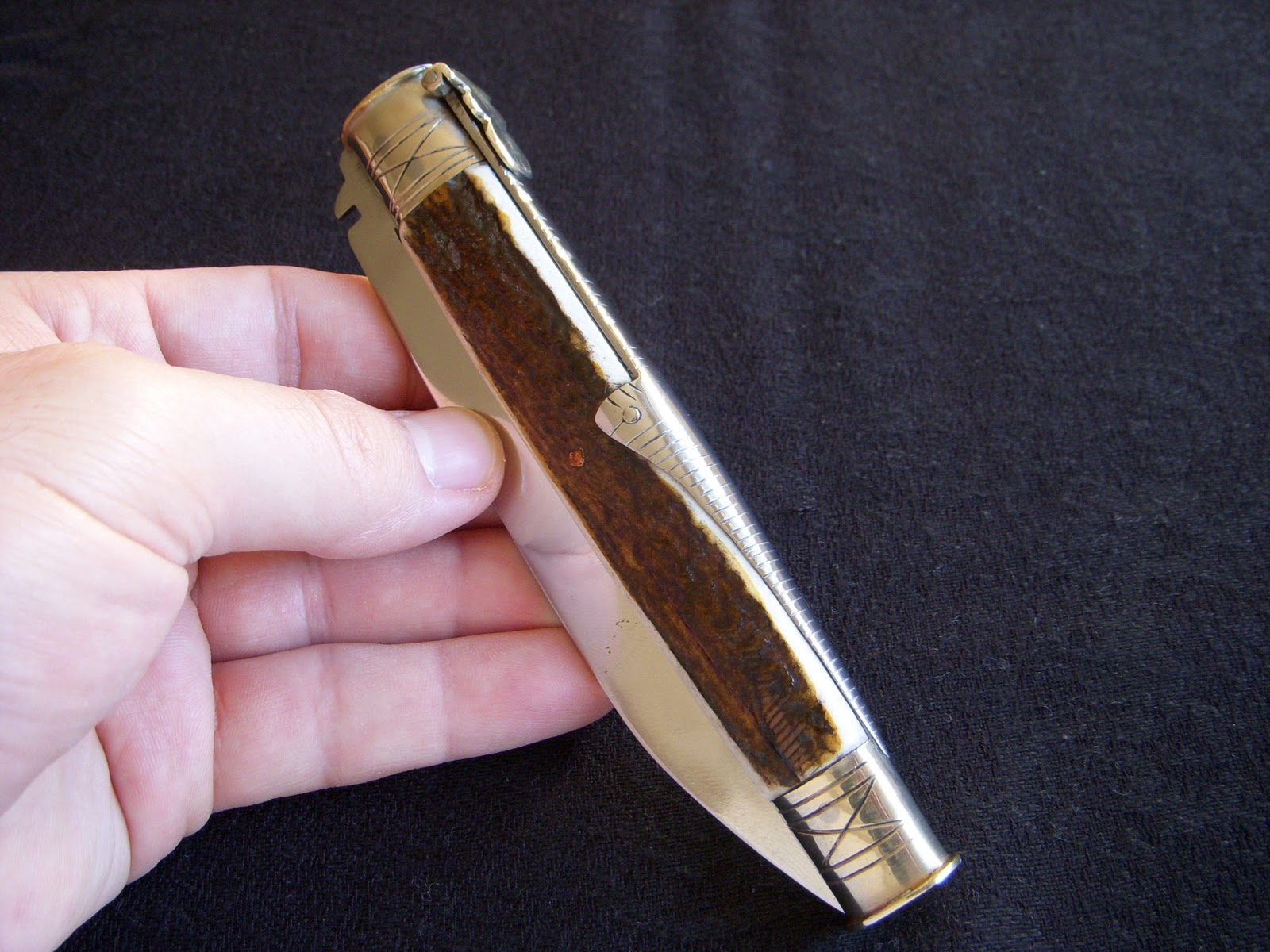Tienen asta de ciervo, cuchilla de acero al carbono, muelle de acero, casquillos de alpaca y la palanquilla también de alpaca y lia.