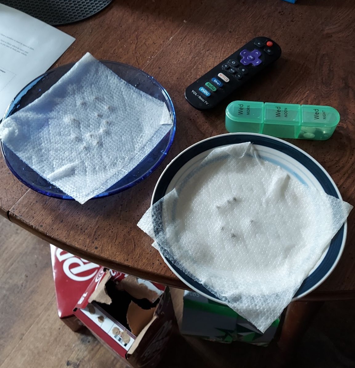 Spread the seeds out on half the paper towel so they don't touch (I use Nitrile type gloves, use something besides your fingers if u don't have gloves .