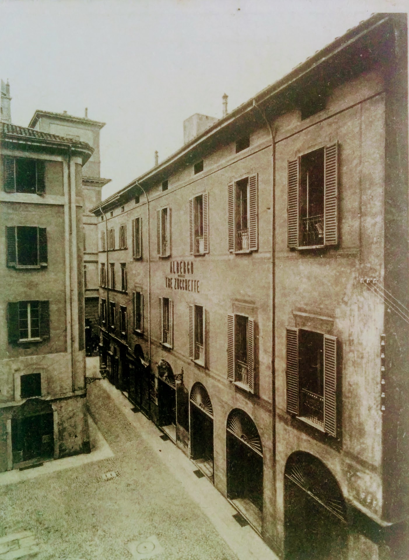 Via e piazzetta della Canepa. L'Albergo Tre Zucchette è il soggetto di questa foto. Sullo sfondo si vede via Rizzoli (visibilmente stretta) con la torre Ramponi traformata in altana, come compare ancora oggi.