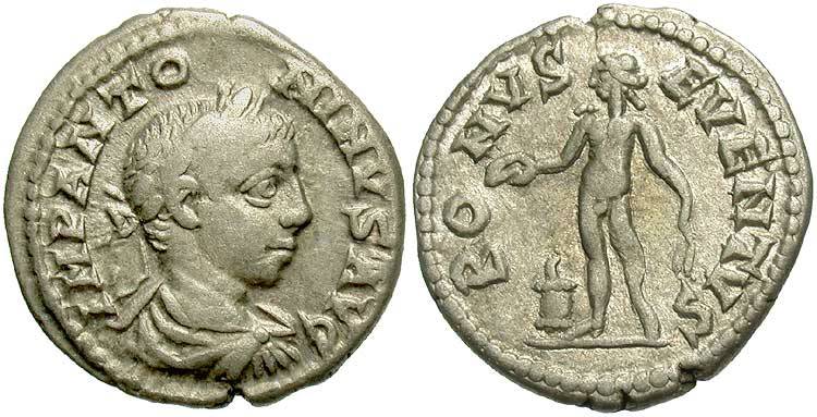 Reverse: BONVS EVENTVS Bonus Eventus, nude, standing left, holding patera and corn-ears; on left, lighted altar. Scarce. (Cohen 14; B.M.) Wildwinds RIC 186 Sear 7504 CoinArchives RIC 186 DirtyOldCoins RIC 186 BeastCoins RIC 186