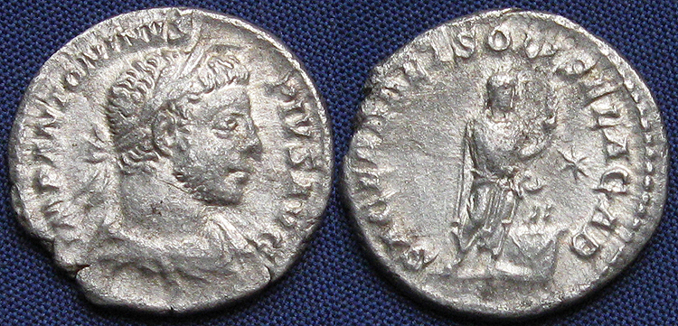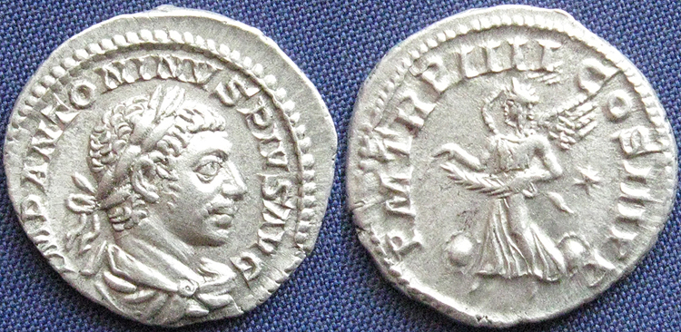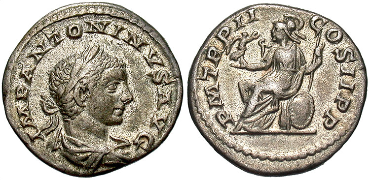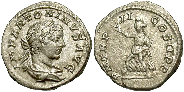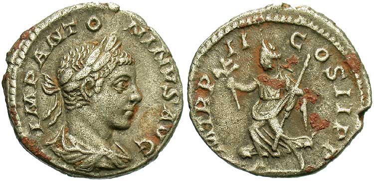Reverse: P. M. TR. P. COS. P. P. Roma seated left holding Victory and scepter, shield at side. Diameter is 21 mm and is 5.43 g, die axis 180 deg. Minted in Rome 218AD. Common. Reference: RIC-001, Sear [2002] 7493, BMCRE-3, RSC-126, T-9, Cohen 125, 126 RIC Plate 2,3 Wildwinds RIC 1 RSC 125 Sear 7493 CoinArchives RIC 1 Forum RIC 1 DirtyOldCoins RIC 1 BeastCoins RIC 1 (interesting, appears to be the same coin as my example. Interesting route it might have taken to get to me, not only about 1800 years, but the last few too) BeastCoins RIC 1