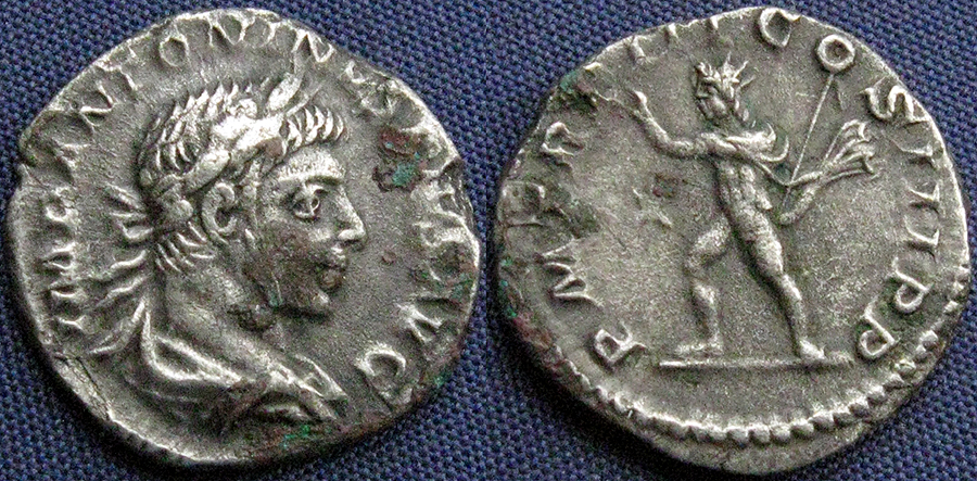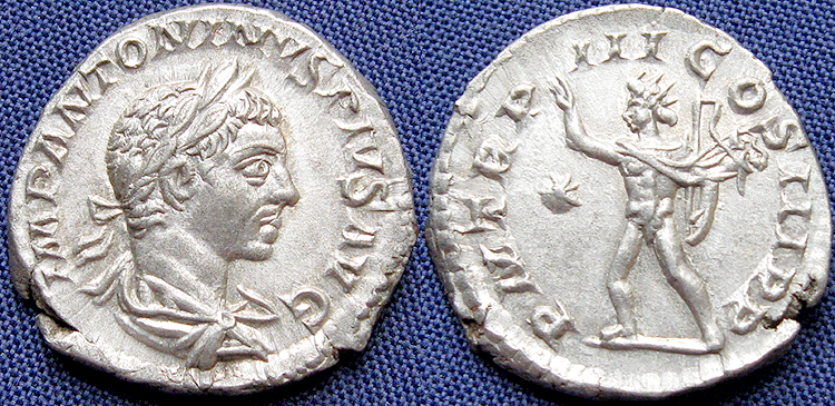 A few notes. The "horn" on top of Elagabalus' head was introduced in 221 AD at the same time as 4 denarii reverses were introduced showing him in Syrian priestly dress sacrificing to the god Elagabal and disappeared a couple of months before his murder in 222 AD. See the SVMMVS SACERDOS AVG coin for a horned example and the P M TR P V COS IIII PP example for one of his very last coins, unhorned. For a great discussion of this see forumancientcoins.com.