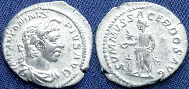 Reverse: SVMMVS SACERDOS AVG Elagabalus standing left, sacrificing over tripod, holding patera in right, and club (downwards) in left; in field, star. Scarce. (Baldwin) RIC NOTE: Possibly other issues of the SVMMVS SACERDOS type (see nos. 146, 147) belong to the mint of Antioch. CoinArchives RIC 200