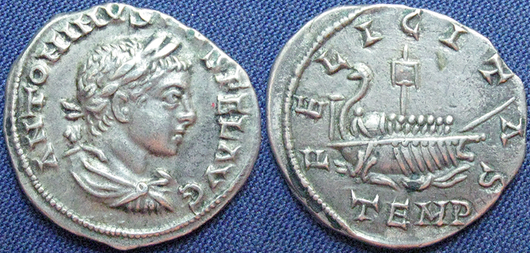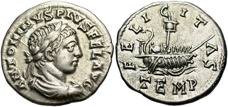 Reverse: FELICITAS TEMP Ship with sail and seven rowers and pilot; on stern, standard and acrostolium; at prow, a furled sail. Scarce. (Cohen 27; Cahn (May 17th, 1922), lot 739; B.M., RIC Plate 3,6) Wildwinds RIC 188 Sear 7510 CoinArchives RIC 188 Forum RIC 188 Forum RIC 188 Forum RIC 188 Forum RIC 188 Forum RIC 188 Forum RIC 188 Forum RIC 188 var variant has FELIX in obverse legend rather than FEL DirtyOldCoins RIC 188 BeastCoins RIC 188 BeastCoins RIC 188