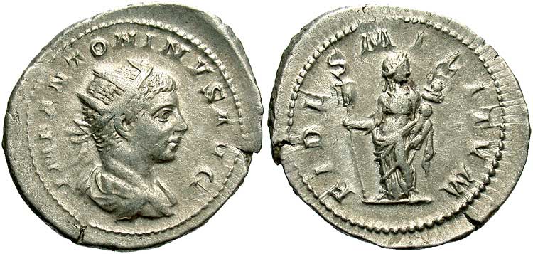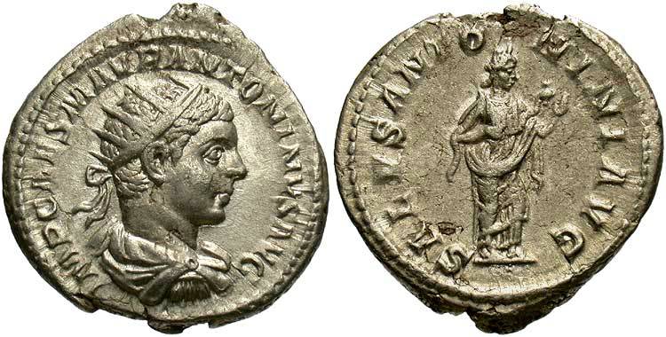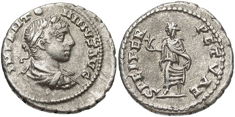 SPEI PERPETVAE: Everlasting hope / Under hope's good and perpetual influence. The writers of A Dictionary of Roman Coins added commentary to SPEI PERPETVAE. "On a silver coin of Elagabalus, who is here, by a wretched piece of flattery made to appear, whilst growing up, to be under Hope's good and perpetual influence. Spei Perpetuae is first found on silver and bronze of Caracalla, whose conduct and disposition from his boyhood upwards also gave the lie perpetual, to such a compliment."