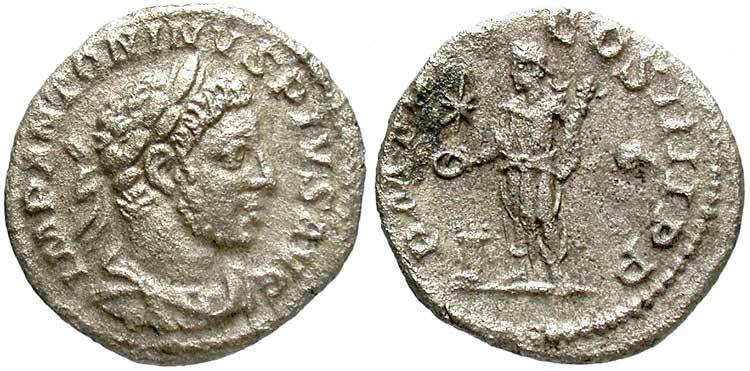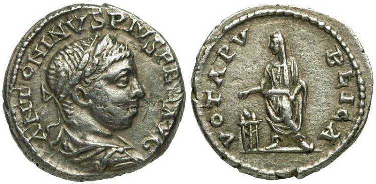 Reverse: VOTA PVBLICA Elagabalus standing left, sacrificing over lighted tripod. Scarce. (R.It., 1908, p. 399.) CoinArchives RIC 203 DirtyOldCoins RIC 203