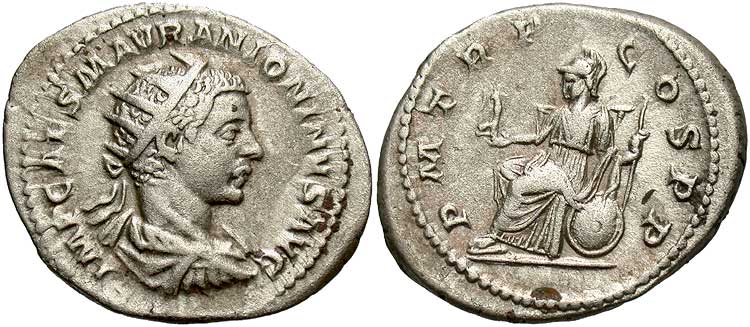Obverse: IMP CAES M AVR ANTONINVS AVG Radiate, draped(, and cuirassed) bust right. (This example appears to be cuirassed)