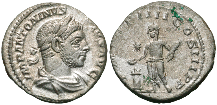 Reverse: P. M. TR. P. V. COS. IIII. P. P. Elagabalus standing left, sacrificing at lighted altar, holding patera in right, club in left; in field, star. Scarce. Cohen 213 RIC NOTE: See also mint of Rome. CoinArchives RIC 181