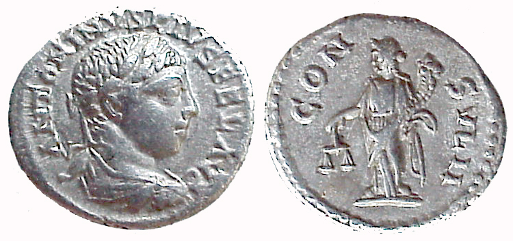 Reverse: P. M. TR. P. IIII. COS. III. P. P. Elagabalus standing left, holding cypress branch and patera over altar sacrificing; a 'star' in left field. Diameter is 20 mm and is 2.66 g, die axis 345 deg. Reference (as if sliver): RIC IVb-46d, Sear [2002] 7536, Cohen-196. Note: If this was minted at the same time that they were using P. M. TR. P. IIII. COS. III. P. P. in Rome, it would have been minted in 221AD.