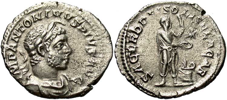 Reverse: SACERD DEI SOLIS ELAGAB Elagabalus sacrificing left at lighted altar, holding patera and club; in field, star. Common. Cohen 246 RIC NOTE: A specimen in B.M. with barbarous reverse reads (SA)CERP. PEI SOLIS ELAGAB. CoinArchives RIC 194