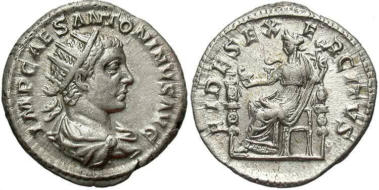 CoinArchives' Elagabalus examples are also linked, however I link those by search results rather than direct links. The reason for that is that this great website only lists the previous 6 months of auctions. If you would like to search on more coins than that you can subscribe to CoinArchives Pro which will allow you to search on more than 10 years of auctions. Results depend on which coins were in the previous 6 months of auctions, so you might receive a "An exact match... was not found. These are the 100 closest matches." On some searches you will get other Emperors and Empresses. You can filter it out with a minus sign. For example the search elagabal "ric 12" right now also returns Septimius Severus and Balbinus. You could put in the search as elagabal "ric 12" -Balbinus in order to remove Balbinus. I did it a different way. I went ahead and put a part of the legend in the search such as elagabal "ric 12" ANTONINVS which works for that example to filter out both. Since there were other emperors who used ANTONINVS on the obverse, on some of them with more distinct reverse I put a portion of that in, such as elagabal "ric 67" FIDES.