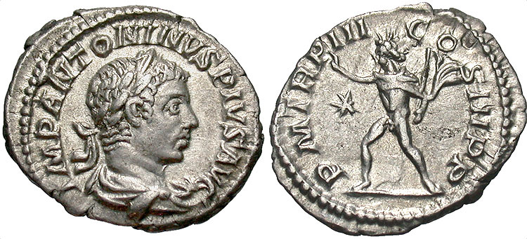 Reverse: P. M. TR. P. IIII. COS. III. P. P. Elagabalus standing left, sacrificing at lighted altar, holding patera in right, club (or cypress branch) in left; in field, star; one standard on side. Common. Cohen 207 CoinArchives RIC 179