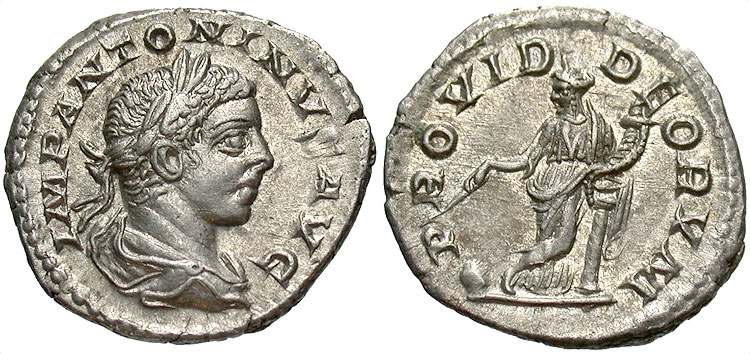 Reverse: P. M. TR. P. II COS. II P. P. Providentia standing left legs crossed, holding rod and cornucopiae, leaning on column, globe at feet. Diameter is 23 mm and is 3.29 g, die axis 170 deg. Minted 219 AD in Rome. Common. Reference RIC IVb-22, Sear [2002] 7496, RSC 146, Cohen 146, 145, RIC Plate 2,4 CoinArchives RIC 22 DirtyOldCoins RIC 22e (not sure the reason for listing the e)