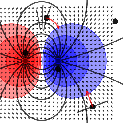 Nota (versiones más antiguas): Encontrarás 5 configuraciones. He calculado la solución implícita de las líneas de campo para 2 cargas (cualquier posición) y N cargas en línea (misma ordenada). En el caso de N cargas y cualquier posición puedes usar el sensor dinámico que calcula varios pasos de una línea de campo (para más, se necesitaría integración numérica que no está implementada).