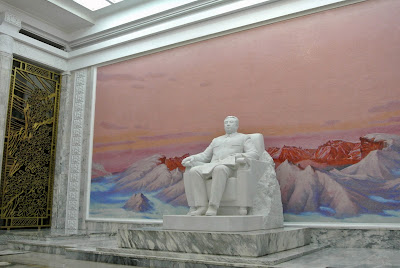 (Above) Large, gilded gates outside the Palace. Heavily guarded, military types everywhere. This country has the 4th largest standing army in the world (1.4 million) and it's the size of Pennsylvania. We weren't allowed to bring anything in--no coats, gloves, cameras, hats, etc. ("No contents!") We entered a series of tunnels with those moving-walkways you find in airports, which we slowly rode for probably 20-30 minutes. The walls were lined with portraits of Kim Jong Il and Kim Il Sung looking at things (famous tumblr here), which turn out to be rather important: Because the Leaders are god-like figures, when one provides "on-site guidance" (which they always can, because they are experts in all things) it's like a benediction. Some favored the portrait of Kim Il Sung behind a gynecologist's chair (insert "on-site guidance" joke here). I preferred the one of him sitting behind a desk double-fisting ears of corn. Behind us in line were at least 600 North Korean soldiers of various rank, for whom this was a solemn occasion and precious opportunity--they may be allowed to visit once more in their lives. The mausoleum part had all the dramatic doom and gloom you can imagine: red-lit marble halls, severe-looking guards, sweeping, lamenting orchestral music. The soldiers would line up in threes at each side of the bodies, and bow deeply. Stone-faced. Also lying in state: the late Leaders' cars, train compartments and even a yacht, all preserved in their former glory. Even Kim Jong Il's platform shoes were on display. I was delighted to learn that he and I shared a taste in laptops: 15" Macbook Pro.