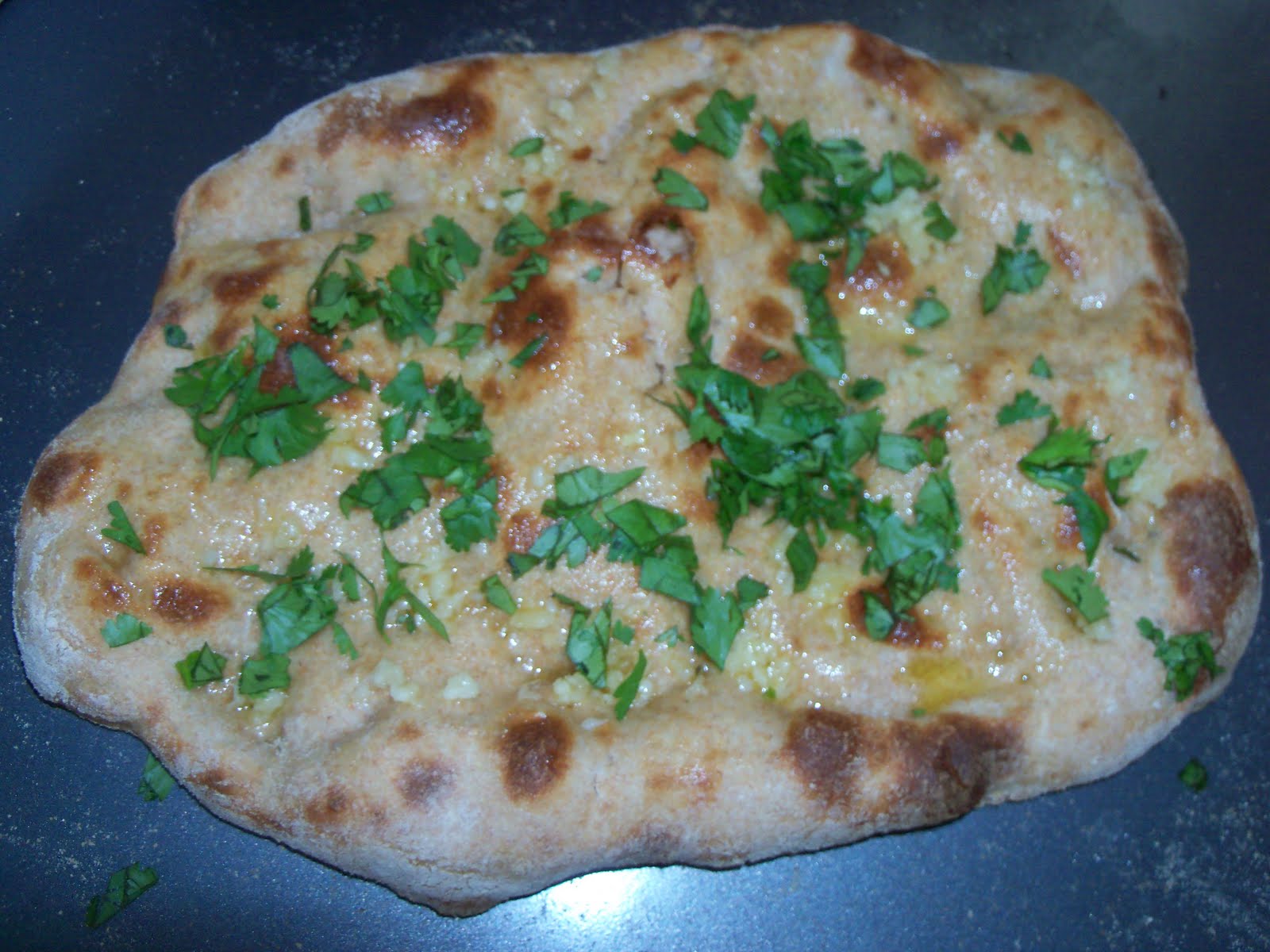 Right after the naan came out of the oven, I brushed it with olive oil (mixed with a pinch of white pepper and garlic salt) and crushed fresh garlic as well as chopped cilantro.