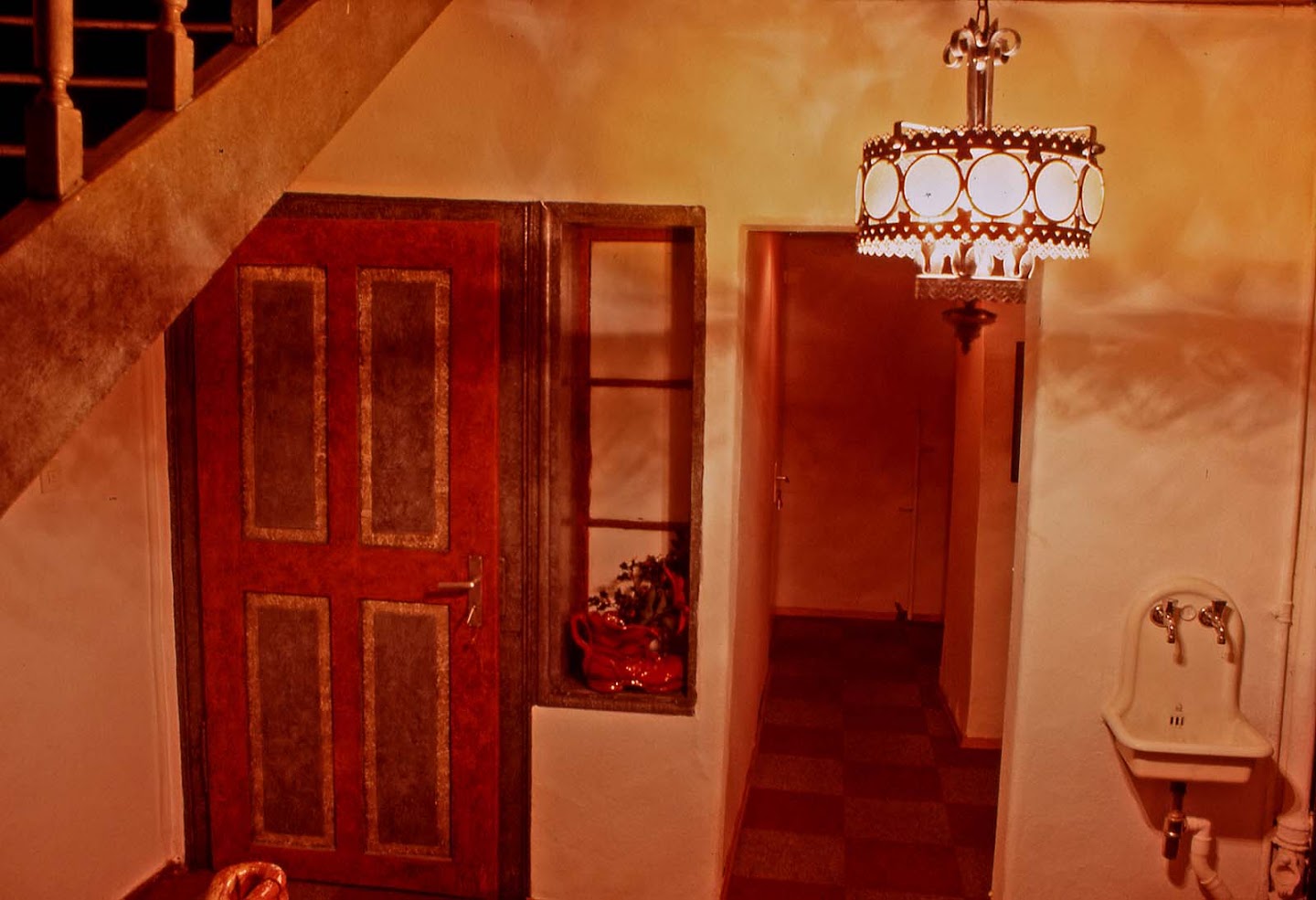Kathy and I were forbidden / afraid to travel there behind the Iron Curtain but preferred the smaller quaint town of Garmisch Partenkirchen (mountains fogged in my '76 shot) in lower Bavaria. Another tourist photo w/o fog. Stayed at this Bayerischer Hof (just noticed our fellow guest on balcony) with community bath down the hall.