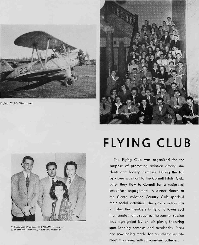 Gene ended up flying maybe 30 different types of planes and helicopters during his career (oldest active pilot). It all started at the primary flight training at Ottumwa, Iowa. These bi-wings were ever so flyable. These lightweight Boeing/Stearman Kaydet N2S open cockpit biplane trainers were used for beginning pilots to really get a feel a seat of the pants hands on feel for what the mechanics of flying was. Yet, Gene had already learned to fly back at SU according to his brother. Found popular 50 member flying club photo from 47 yearbook.
