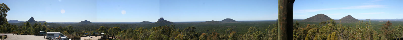 Hieronder de Glass House Mountains. Zo genoemd door captain Cook omdat hij ze vond lijken op glasovens.