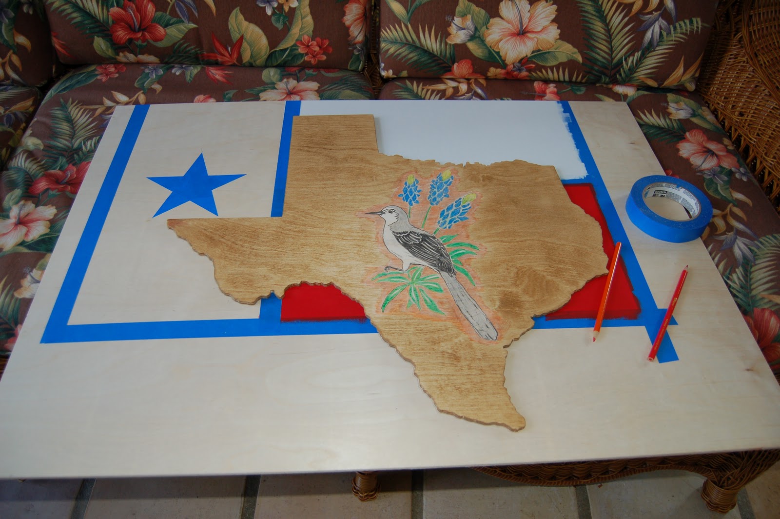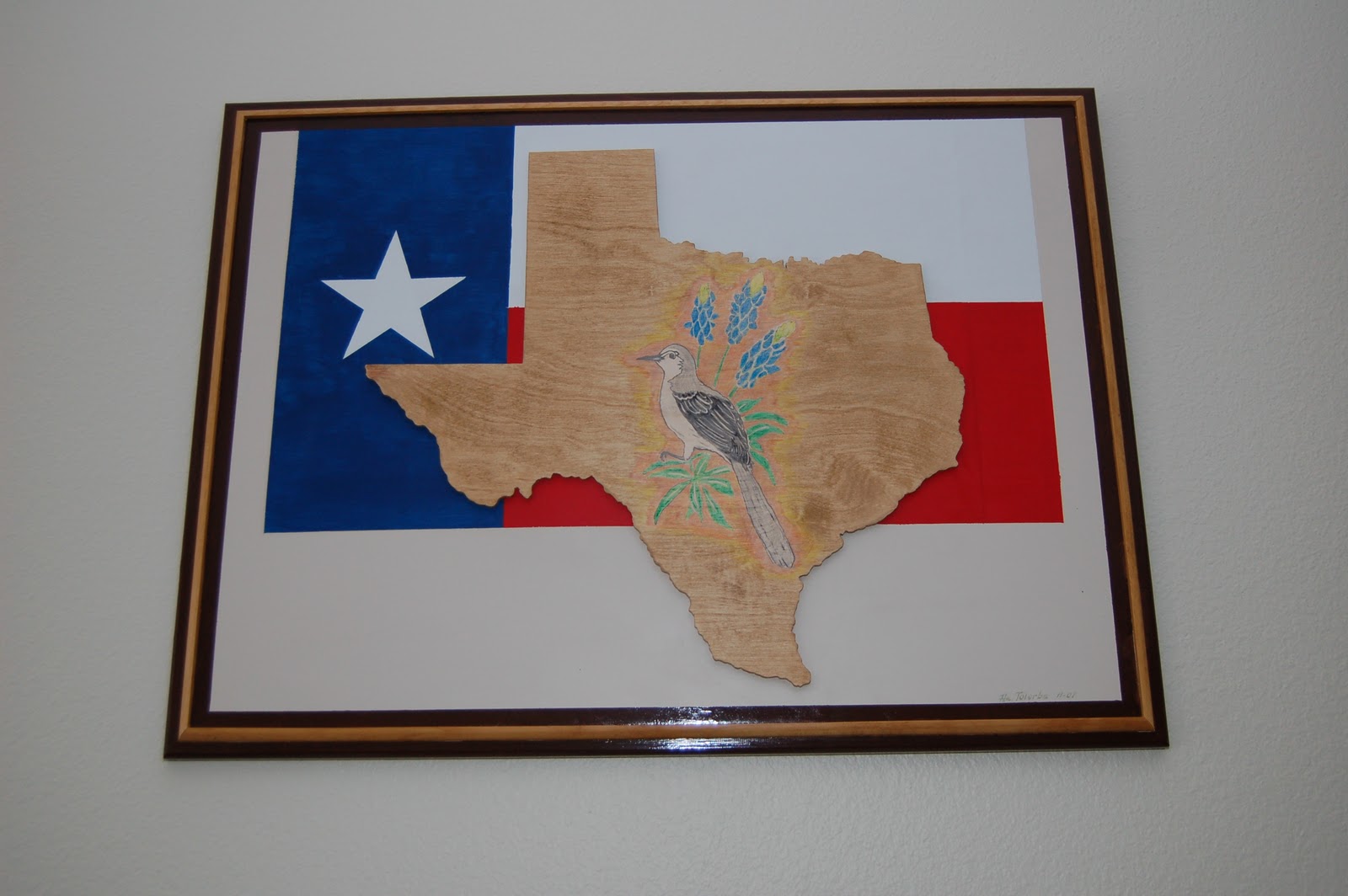 Crayola of the mockingbird (State Bird) and Bluebonnet (State Flower) over plywood and paint for the Texas flag completed this project.