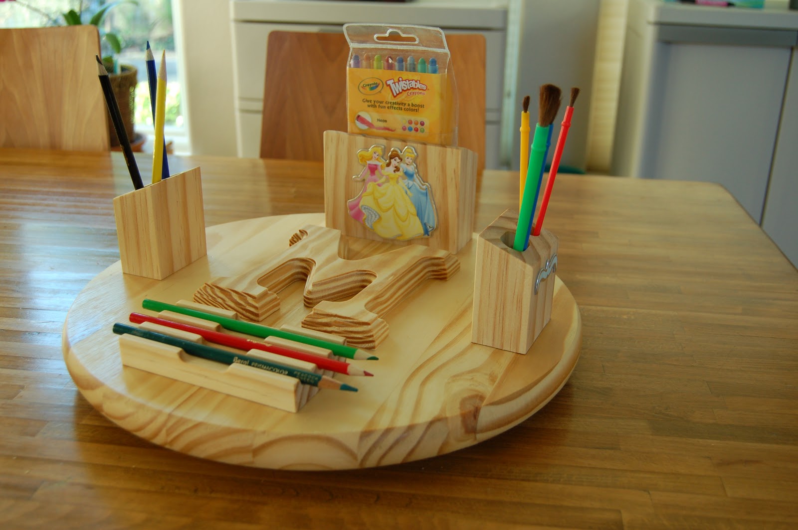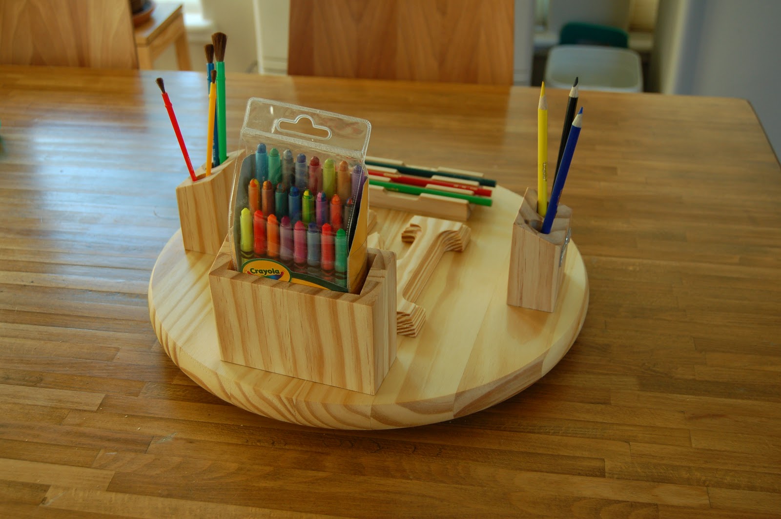 This is a second version of a young artist's carousel for a three year old grand daughter. See "The Lazy Susan Got Lazier" for the making of the base. As I explained in that project, the turn table can be quickly and easily made for under $20. For this project, the "accessories" were added to hold the box of crayola, and holders for pencils and brushes. Click on pictures for a larger image.