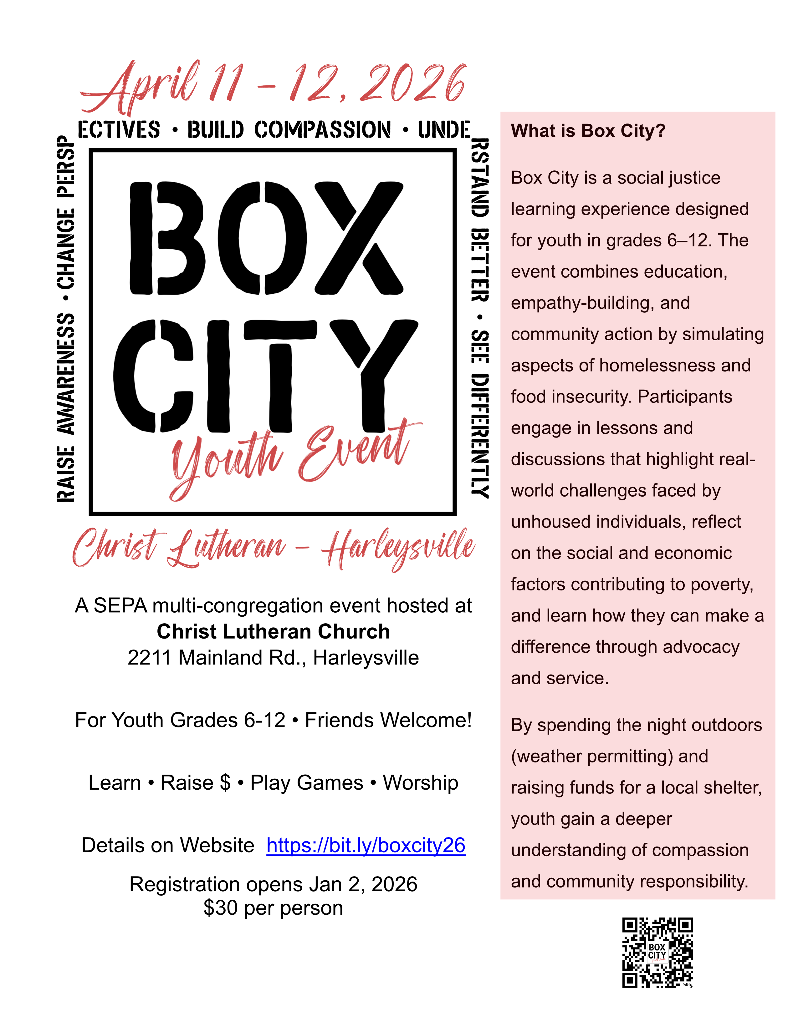 Share and post this flyer anywhere you think someone would be interested in learning more about Box City. Suggestion: Print out extra copies of the flyer and take it with you when you are soliciting sponsors.