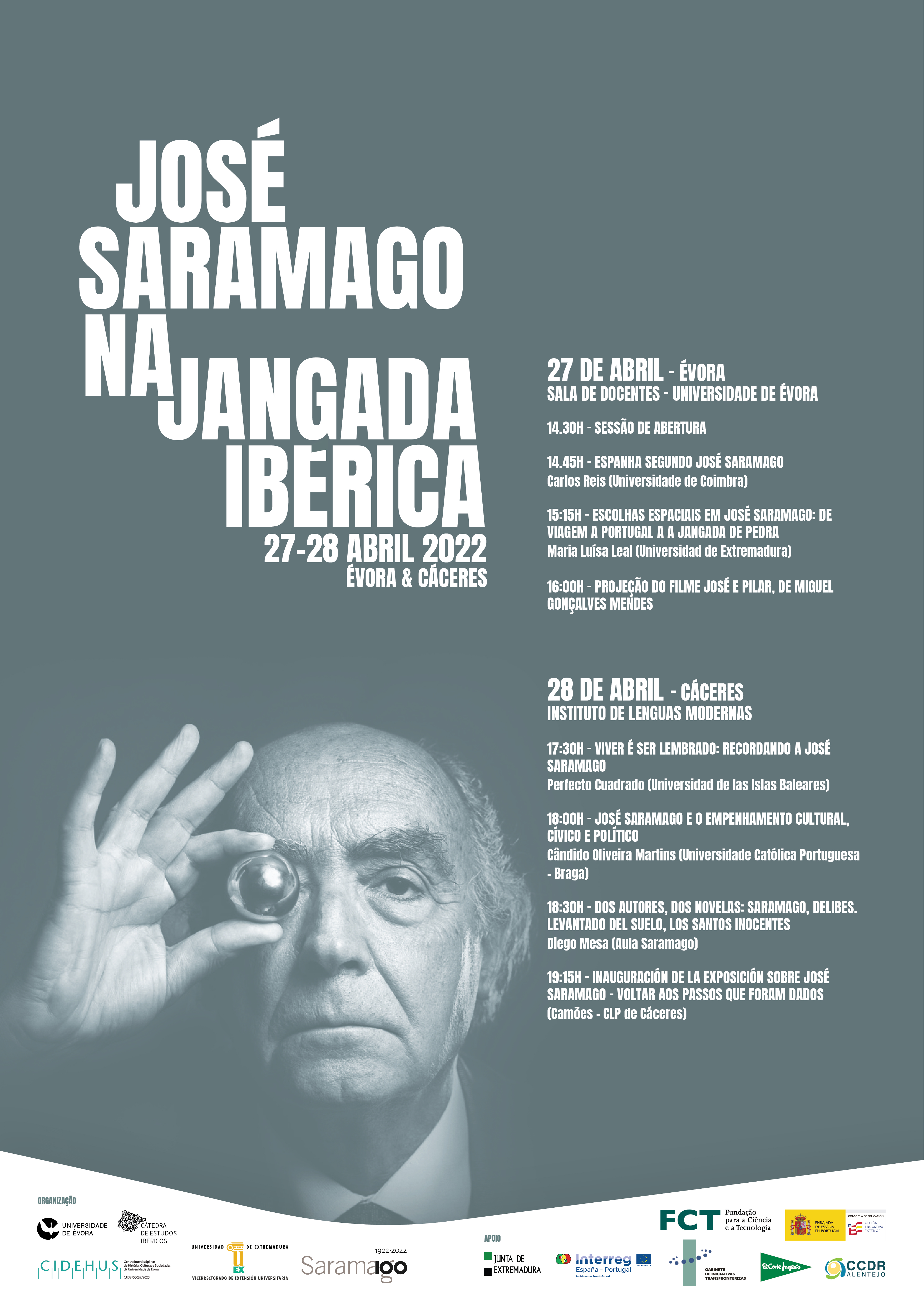 Realiza-se entre os dias 27 e 28 de abril 2022, na Sala dos Docentes, do Colégio do Espírito Santo, e no Instituto de Lenguas Modernas, em Cáceres a jornada José Saramago na jangada ibérica.