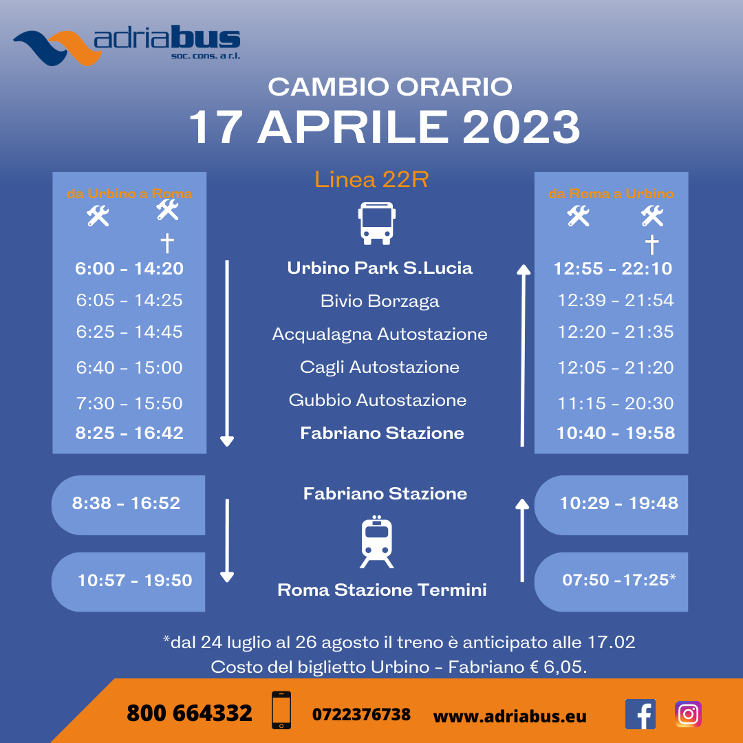 Once you reach Pesaro train station, you have to take a bus to Urbino. The bus schedule is available here. Set in the form: "Pesaro Stazione FF.SS" as the departure station and "Urbino Park S. Lucia" as the arrival location. In Pesaro, buses leave from the square in front of the train station. The bus company is called Adriabus. You can recognize the right bus by looking at the label in front of the bus. The bus to Urbino is indicated with "LV Linea Verde Urbino" (the return bus is indicated with "LR Linea Rossa Pesaro").