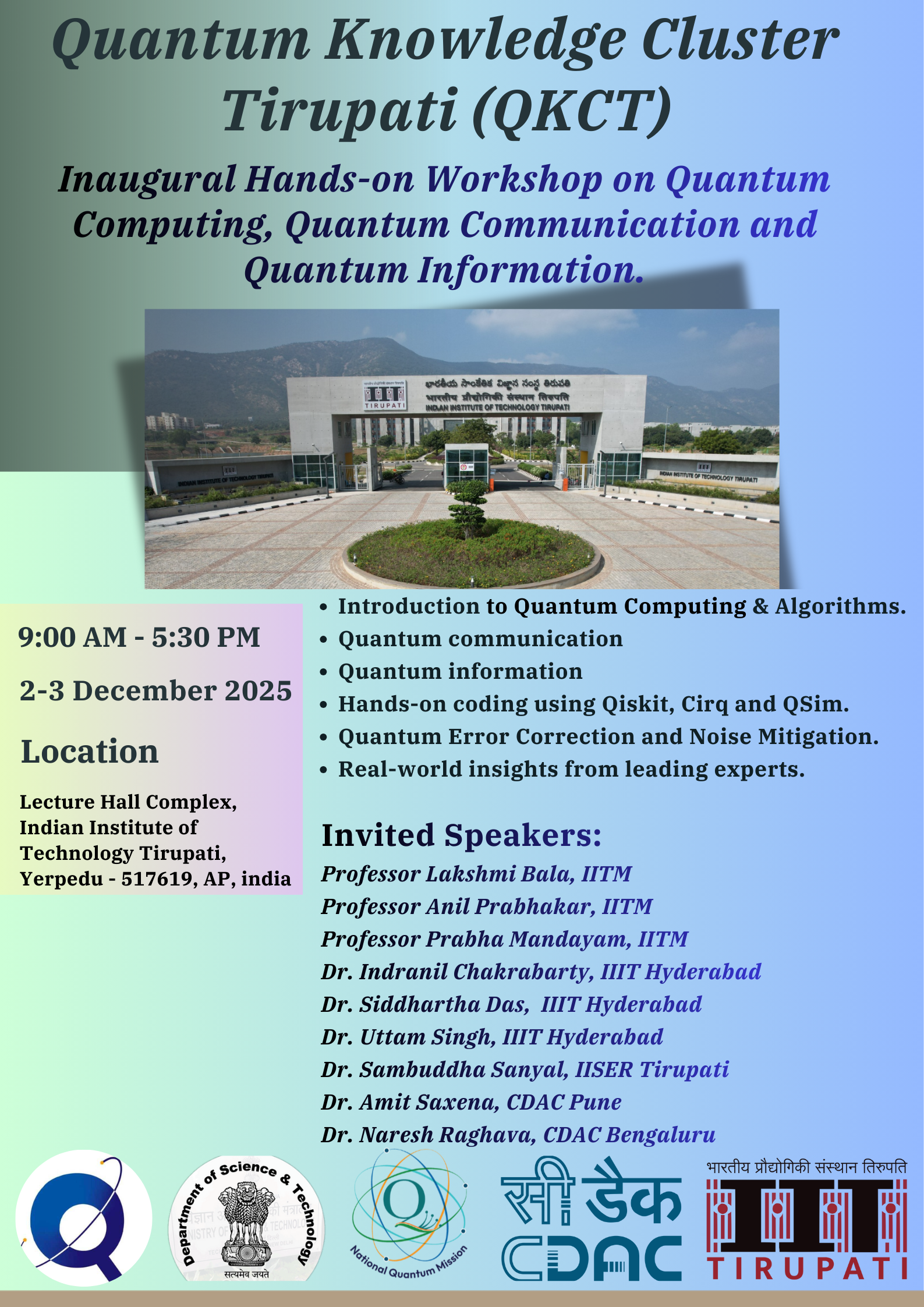December 2025: Arijit along with Dr. Aravinda S. and Dr. Sambuddha Sanyal (IISER Tirupati) jointly organized the inaugural workshop of the QKCT (Quantum Knowledge Cluster Tirupati) supported by the SAMGYNA Quantum Communication Hub at IITM. CDAC Pune and Bengaluru were the knowledge partners of the workshop.