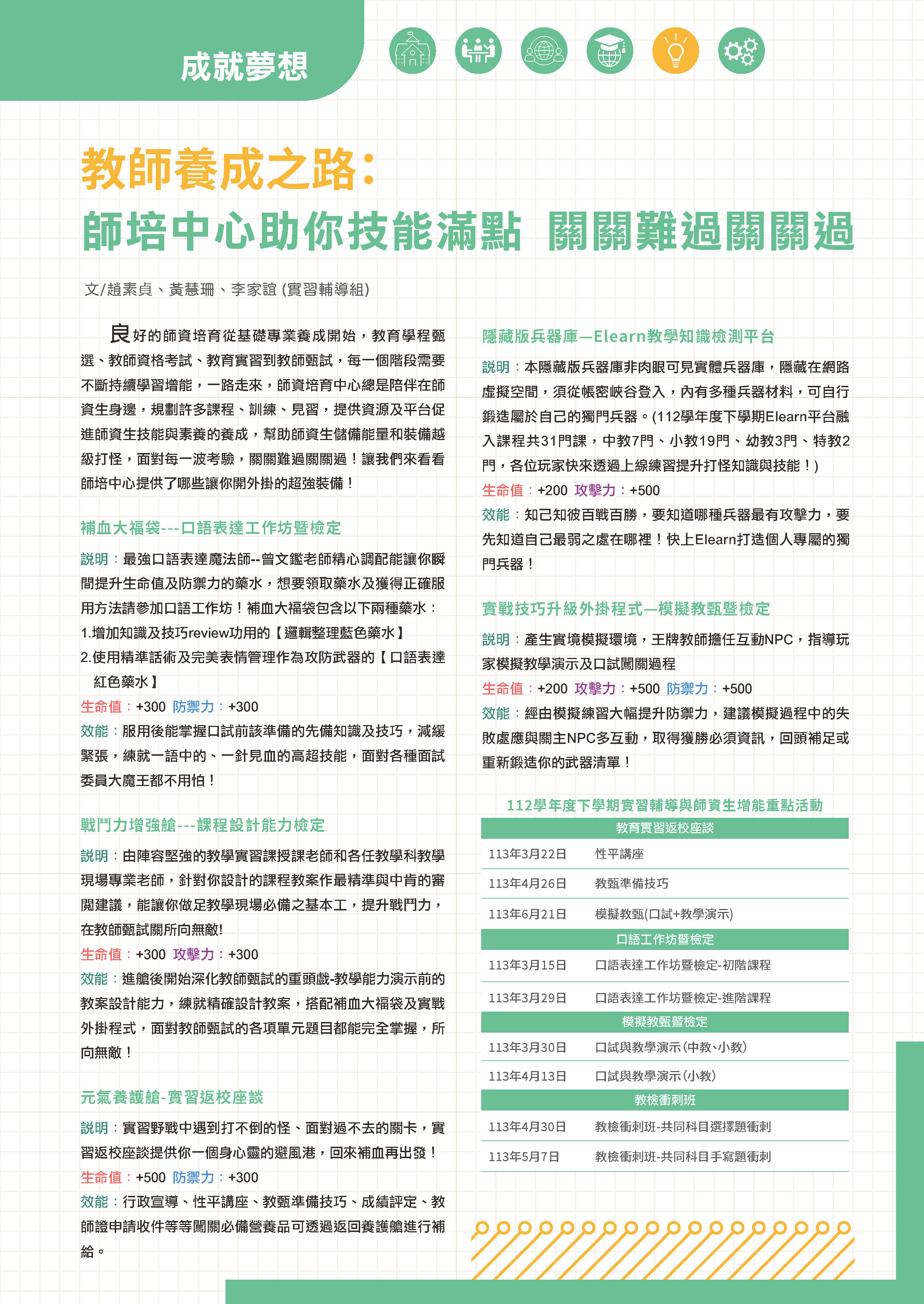 良好的師資培育從基礎專業養成開始,教育學程甄選、教師資格考試、教育實習到教師甄試,每一個階段需要不斷持續學習增能,一路走來,師資培育中心總是陪伴在師資生身邊,規劃許多課程、訓練、見習,提供資源及平台促進師資生技能與素養的養成,幫助師資生儲備能量和裝備越級打怪,面對每一波考驗,關關難過關關過!讓我們來看看師培中心提供了哪些讓你開外掛的超強裝備!....(詳細內容)