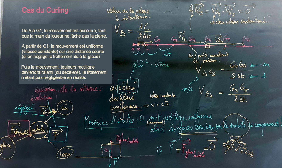 MOUVEMENT D'UN SYSTEME - 1/2 h : résumé des notions de mécanique vues en 2nd : Rappel 1 cas du Curling, (principe d'inertie, vecteur vitesse intantanée) avec cas force frottement (et décomposition du vecteur F en composante normale Fn et tangentielle Ft) + Rappel 2 (en rapport avec la 2ème Loi de Newton vue cette année) : direction et sens de la variation du vecteur vitesse identiques à ceux de la résultante des forces extérieures (somme vectorielle) appliquées au système