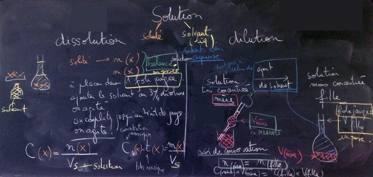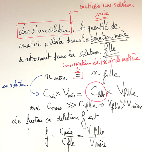 Quantité de matière espèce chimique à l'état solvaté. Correct (dispo en fin de semaine) des Exos 1ère sur dissolut° et sur dilution en vue de l'(AE 03) de la semaine prochaine, Importance de la dilution, (dilution = conservat° qt matière entre mère et fille) pour la réalisation des solutions étalon (filles) à partir d'une solution mère. Importance de la relation littérale et de mettre les unités. Résumé schématique au tableau sur les protocoles (à savoir écrire) dissolution et dilution. Le matériel disponible dans un laboratoire de chimie (pipettes jaugées et graduées, fioles jaugées) sera montré par le professeur.
