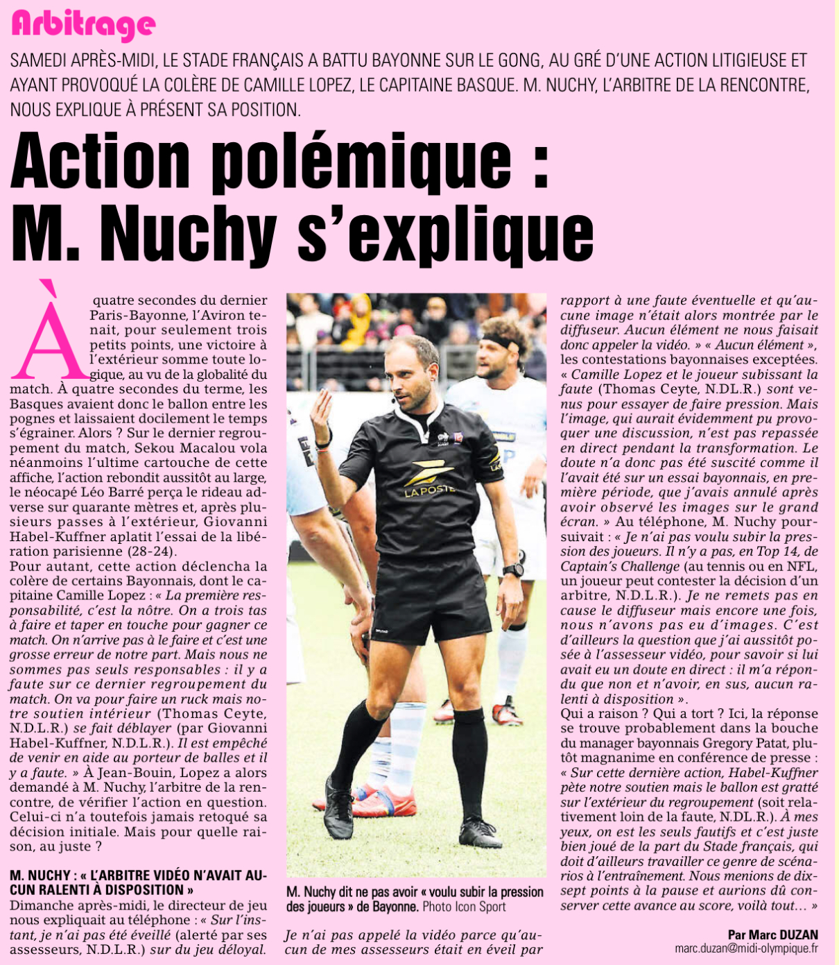 N'ayant pas tout suivi le samedi et le dimanche, j'ai vu juste que Bayonne a perdu le match sur une dernière action de jeu, où le capitaine de l'Aviron Bayonnais, demande à l'arbitre de checker (notons l'utilisation de ce terme, plutôt que vérifier) ce que l'arbitre semble juste faire par une discussion orale avec l'arbitre vidéo.