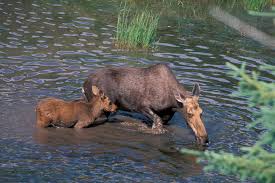 In hot weather, moose are often found wading or swimming in lakes or ponds.