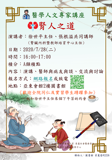 配合本館「腎利人生」圖書資源特展舉辦之講座,並由本院腎臟內科暨教師培育中心徐世平主任及張根溢共同講師以「醫師與病友與談」方式交流與討論。