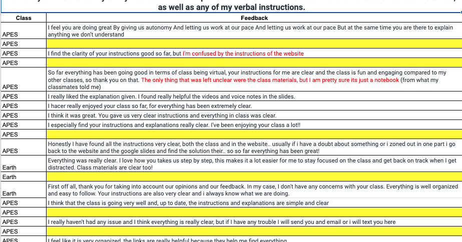 Every day, as students are logging into my classroom (how strange to say) and I am doing attendance, I encourage students to voluntarily do a check-in form for me, that I will review during the day and period. I only ask three questions-- how are you, do you have technology issues, and do you need me to call you? It gives them something to do. I share my answers for those three questions once we are beginning so they know where I am at, too. The visual representation of what they share with me is below. For some more information about how I implement the strategy, as well as how I use this data to adapt to my students' needs, check out the blog below!