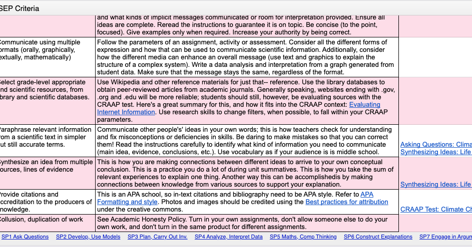 This is a living document. As I identify criteria I lack, I will add those to the respective SEP. As I receive feedback about the clarity of my criterion-based comments, I will revise the clarifications to reflect needs of students and authentic applications in class.